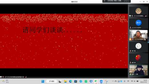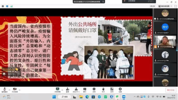在最后的“请同学们谈谈”这一环节中,同学们积极踊跃的发言,谈了自己对疫情的理解和对疫情防控的看法。同学们表示,当前疫情十分严峻,自己一定会珍惜学校的疫情防控成果,在接下来的日子里,一定会合理作息,保持良好的学习生活节奏,将精力投入到学习中,保证学习效果,坚持运动,保证身体健康。要正确佩戴口罩,养成良好的生活习惯,勤洗手,多通风,保持饮食健康。同时,同学们表示一定会定时定期完成核酸检测,寄取快递要佩戴口罩,注意消毒。注意甄别网络信息,不相信、不传播有关疫情信息的谣言。积极配合学校各项防控要求,不放松应对,精准有效、科学有序控制和降低新冠肺炎疫情传播风险,打好疫情防控阻击战。