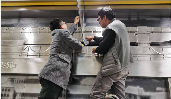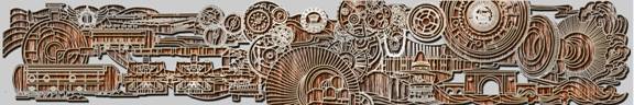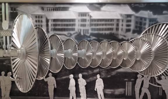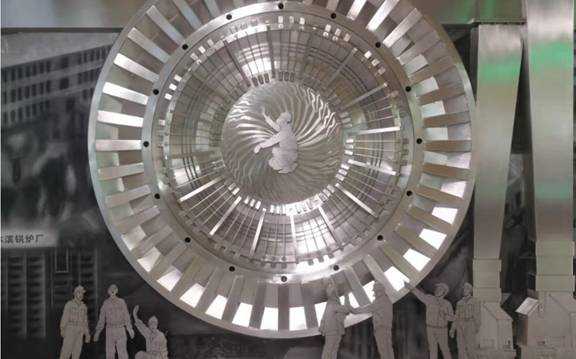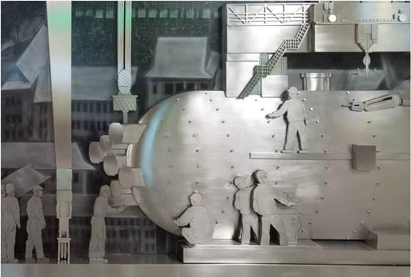 壁画制作注重细节,采用无缝锻造,打磨抛光的技术,巧妙运用应力的释放,可谓工艺制作用心良苦。虽然焊点无数,但在表面几乎看不到焊接痕迹,堪称一绝。建筑底板腐蚀形成深邃的背景和精美着色,将观赏者的思绪拉回到了当年大工业生产的火红年代。作品右下方大锅炉呈双曲拱形的高难度制作,更是大国工匠精神的至高体现,为广大市民呈现了一幅极具欣赏价值,制作精良、工艺绝妙的壁画佳作。