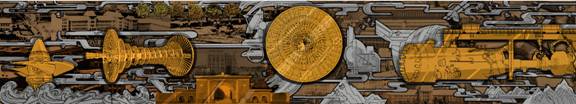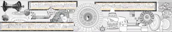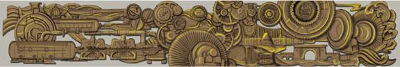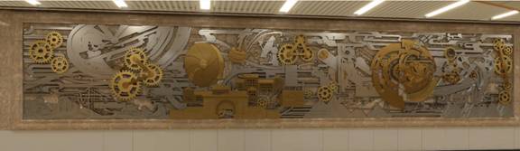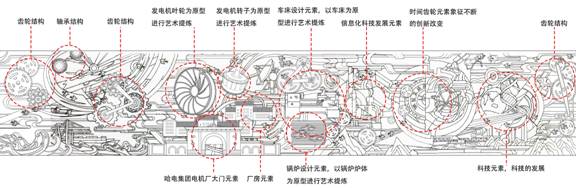 整幅壁画分别以哈尔滨电机、锅炉、汽轮三个领域的大型机器为视觉设计的主体物,以三个厂区的老厂房建筑为背景,展示哈尔滨重工业制造中名、优、特的重量级锅炉、叶轮、转子及制造业典型构件。用吊车、龙门架等设备和纪念徽章为链接,拉近时空、铭刻记忆、凝聚历史,展现“三大动力”的雄伟与辉煌。作品设计构思巧妙,以场景衬托现场工作的人物,以人物又烘托出机器元件设备的巨大和宏伟。同时,采用不锈钢材质,运用拉丝工艺,与工业题材壁画有机融合,极具工业特色飞速发展的现代感。