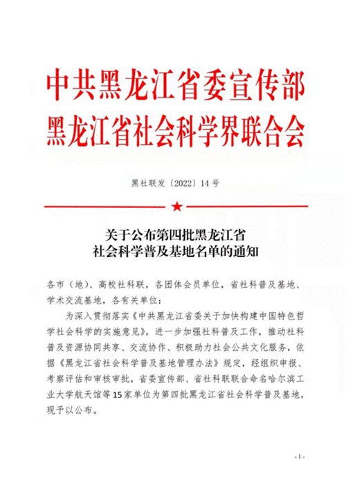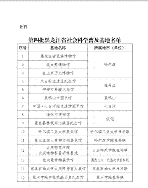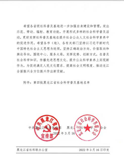 为深入贯彻落实中共黑龙江省委关于加快构建中国特色哲学社会科学的实施意见,进一步加强社科普及工作,推动社科普及资源协同共享、交流协作,积极助力社会公共文化服务。学校依照《黑龙江省社会科学普及基地管理办法》的规定,积极组织申报,我校“黑龙江四大精神文创展览馆”经过考察、评估和审核审批,获批黑龙江省委宣传部、省社科联联合命名的“黑龙江省社会科学普及基地”。