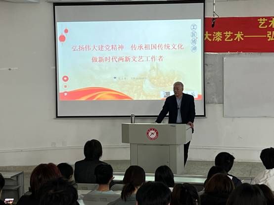 夏立军为进一步带动广大同学们学习热情,着重解读了中共二十大精神内涵和大漆艺术的历史文化底蕴、“大漆工艺”及漆艺文创产品的创意设计与制作,并于师生现场互动。