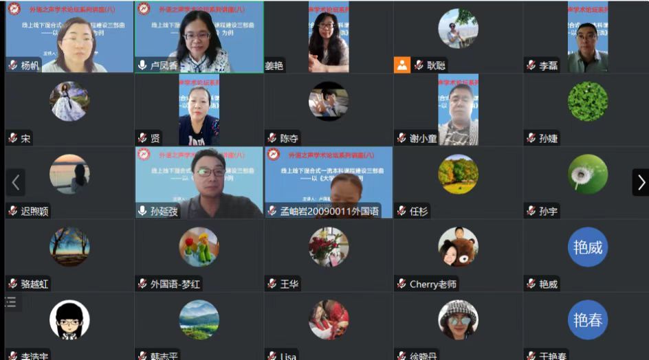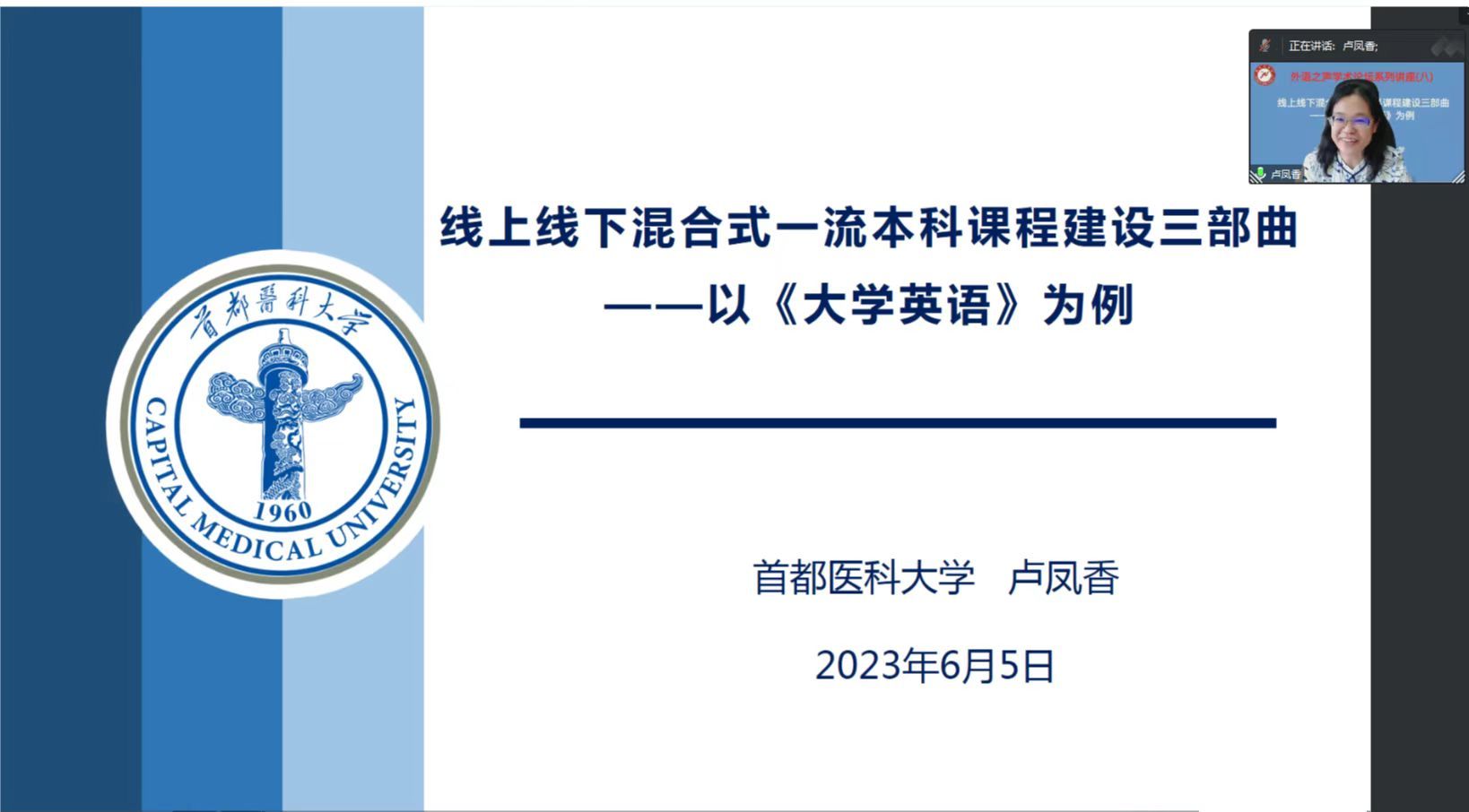(文/耿聪)为积极推进一流课程建设,切实提升课程育人功能,6月5日下午,在教务处指导下,外国语学院以线上方式成功举办了第八期“外语之声”学术论坛讲座。主讲嘉宾为北京市高等学校教学名师、首批和第二批国家级一流本科课程负责人、首都医科大学医学人文学院院长卢凤香教授。讲座题目为“线上线下混合式一流本科课程建设三部曲——以《大学英语》为例”。讲座由外国语学院院长孙延弢主持,外国语学院全体专任教师参加了此次学术讲座。