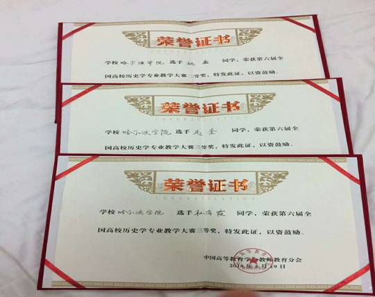 大赛分说课、讲课两部分,比赛采取现场抽取比赛场次、比赛内容和出场顺序的办法,不仅提升了比赛难度,更加体现了比赛的公平公正。来自东北师范大学、陕西师范大学、华中师范大学等部属院校在内的全国97所高校参加比赛,参赛选手293名,领队及指导教师176人,此次比赛竞争激烈,规模空前。我校历史学专业14级赵奎、姚盈、杜海霞三名同学在尹英杰、白冬(萧红中学)两位老师的带领下参加了比赛。这是历史学专业学生第一次参加此类比赛,由于接到通知晚,从组建参赛团队到比赛结束,仅仅一个月的时间。在时间紧、任务重的情况下,为了能够取得好成绩,团队制定了“齐心合力、分工协作、资源共享”的策略,根据比赛的要求,制定了周密的计划,在师生的共同努力下,学生凭借着扎实的专业基本功和师范技能,参赛的3名同学全部获奖,其中姚盈获二等奖,赵奎、杜海霞获三等奖,指导教师尹英杰获优秀指导教师奖。首次参赛,三名同学就能全部获奖,这在参赛院校中也是不多见的,充分展现了我校历史学专业学生熟练的教学技能和教师良好的服务学生成长的奉献精神。