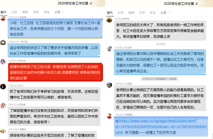 疫情教会我们的那些事。这次的疫情,对教育事业来说是一场巨大的挑战,挑战不在于我们是不是利用线上平台授课。而是我们的青年是否得到了反思,得到了成长。疫情总会过去,但在这段时间里,青年大学生应该思考些什么。黄莹老师在第一节伦理课的最后,设计的这样一个讨论的环节,疫情到底教会了我们什么?作为青年的一代,在国家遇到危难的时候你有没有参与其中,奉献自己的力量?“青年兴则国家兴,青年强则国家强。青年一代有理想、有本领、有担当,国家就有前途,民族就有希望。中国梦是历史的、现实的,也是未来的;是我们这一代的,更是青年一代的。”在对抗疫情的过程中,社工系的同学也加入了社区一线的服务队伍中,黄莹老师用他们的例子鼓舞大家,做有为青年。