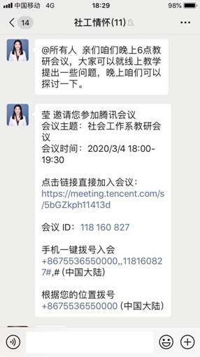 3月4日社会工作各教研室通过腾讯会议平台进行教研室活动,会上就开学第一周线上教学授课教师遇到的问题进行了探讨,如:线上教学是否有好的方法可推动学生的积极性;毕业年级的论文开题工作如何开展;如何做好考研复试同学的线上指导等。针对以上的问题教师们展开激烈的讨论,献计献策。本次教研活动持续近二个小时,气氛热烈,富有成效,教师们基本掌握了各个线上平台的课程建设及开展班级活动方法,提升了开展线上线下混合式教学的能力,进一步明确了及时开展新学期的线上教学活动目标。