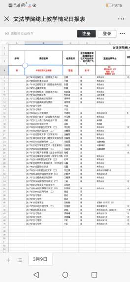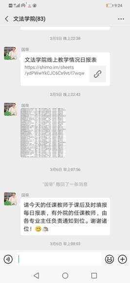 为提高线上教学质量,学院在工作群里以接龙的方式统计每日授课情况,内容包括学生出勤、教学资源、教学活动、存在问题、所需支持等。从汇总的线上教学日报表可以看出,开学第一周学院教学秩序井然。面对线上教学高峰时段网络拥堵的现象,教师们灵活应对,积极启动备用方案;学生出勤率高;对于老师和学生提出的问题,学院积极解答并给予解决措施。