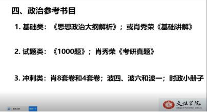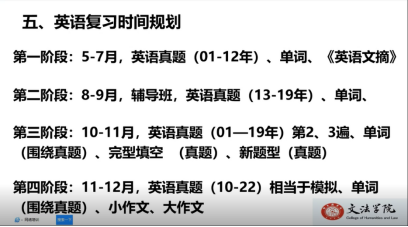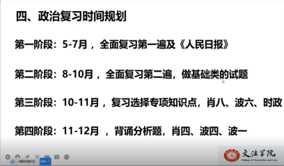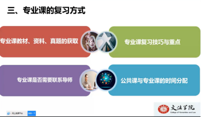其次,在专业课学习上,邵老师强调专业课分数占比最高,所以一定要尽早尽快开始专业课学习。邵老师指出专业课信息掌握也非常重要,真题、笔记、参考书目尽可能多的去掌握。并且在掌握信息后,如何使用也非常重要。并不能只抱着学长的笔记死记硬背,而应该在第一遍专业课学习时,以他们的笔记为参考,自己整理出笔记。邵老师还为不同考研方向的同学规定了专业课几轮的复习时间,12月之前完成三轮的专业课学习。邵老师还通过自己多年阅卷经历强调了文科考研字数的重要性。第二遍复习时直接背诵笔记,背诵分论点,熟悉书本上的具体事例加以补充。在时间分配上,邵老师建议:政治每天一个小时;英语四六级通过的保证两个小时学习时间即可,没有通过则延长一个小时英语学习时间;专业课保证至少五个小时学习时间。
