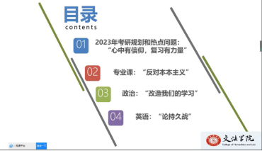 会议开始,邵老师以学长的身份简单回忆了他在哈院求学期间的考研经历,那份专注刻苦深深鼓舞了学弟学妹们。首先,邵老师用他对于考研的丰富指导经验为学生们分析了现今毕业的几种选择,为学生们下一步毕业的方向选择提供了重要的指导意义。就考研方向来说,邵老师为学生们细致分析了2023年考研形式,考研院校、地域、专业的选择等问题。