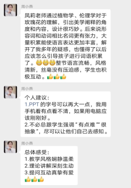 周凤莉老师本节课的授课内容是美学的研究方法,她先是强调了马工程教材中所指的美学研究方法不是具体的研究方法,而是指美学研究思维。围绕这一问题,她进行了深入的讲解,在讲课过程中,周老师能够在尊重学科特性的基础上充分考虑到学生的接受程度,将抽象的理论具象化,讲课风格平实、质朴,努力将个人的学识和思考转化为授课内容,力求学生课堂受益最大化。 听课结束后,各位听课教师纷纷对周凤莉老师的授课情况进行了点评,涉及到授课内容、授课风格、学生听课效果等各个方面,老师们一致认为:周老师的授课风格平实、质朴;授课内容层次分明、逻辑严谨;互动话题设置得合理巧妙,学生参与度较高。同时,老师们也善意地指出了其不足处,并给出了宝贵的建议。听课老师的点评专业、精准,不仅有高度,更有热度,周老师表示受益匪浅,将牢记同事们的箴言惠语,将其作为前进的动力和财富。至此,该项教研活动被推向了高潮。