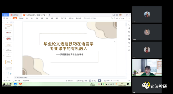 第一位主讲人是来自汉语国际教育的青年教师刘子楗,她的分享以毕业论文选题技巧在语言学专业课程中的融入为题,以自己的实际经验为例讨论了教师如何在授课过程中帮助学生整体提升学术能力和素养,以更好地完成培养目标与毕业要求。