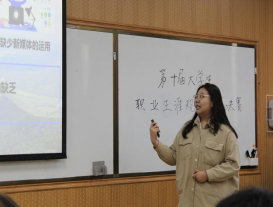随后,评委老师对每一位选手进行打分,在统计分数的过程中,由于十号选手韩雪和九号选手选手邹凤家喻的分数一样,比赛进入到紧张而又刺激的加赛环节。首先是邹凤家喻进行自我介绍,在介绍的过程中,她用清晰的语言、流畅的表达,将自己的职业目标、发展路径以及实施计划娓娓道来,仿佛怀着必胜的决心。而她的对手韩雪也不甘示弱,面带自信的微笑,眼神中透露出坚定与执着,仿佛在向观众和评委们宣告着自己对未来职业生涯的憧憬与决心。评委老师也对两位选手进行了最后的提问并作出自己的选择。