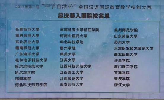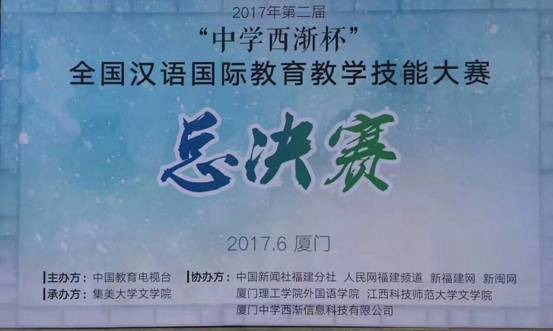 2017年6月3日,由中国教育电视台主办,中国新闻社福建分社、人民网福建频道、新福建网、新闽网、厦门理工学院、厦门中学西渐信息科技有限公司协办,集美大学文学院承办的2017年第二届“中学西渐杯”全国汉语国际教育教学技能大赛在厦门集美大学隆重举行,来自全国30支高校代表队参加了决赛,我校在此次比赛中表现优异,获得了理论竞赛第一名,课件制作第一名,团体总分第一名的好成绩,并最终获得了一等奖。